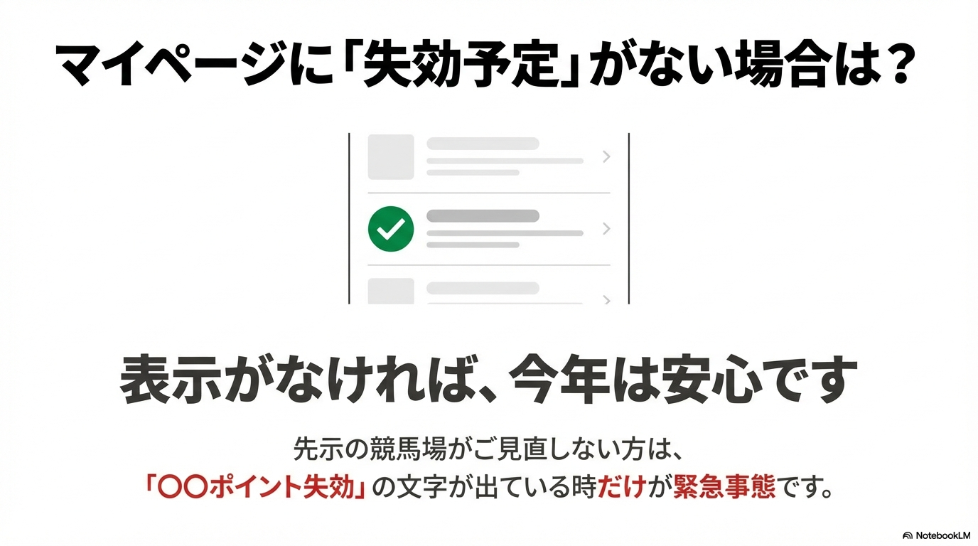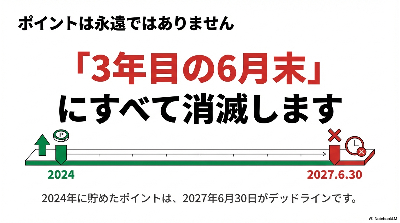 具体的には、ポイントが付与された日の属する年から3年目の6月末が利用期限となります。例えば、2024年の1月に獲得したポイントも、12月の有馬記念の時期に獲得したポイントも、等しく2027年の6月30日が運命のデッドラインになるわけですね。