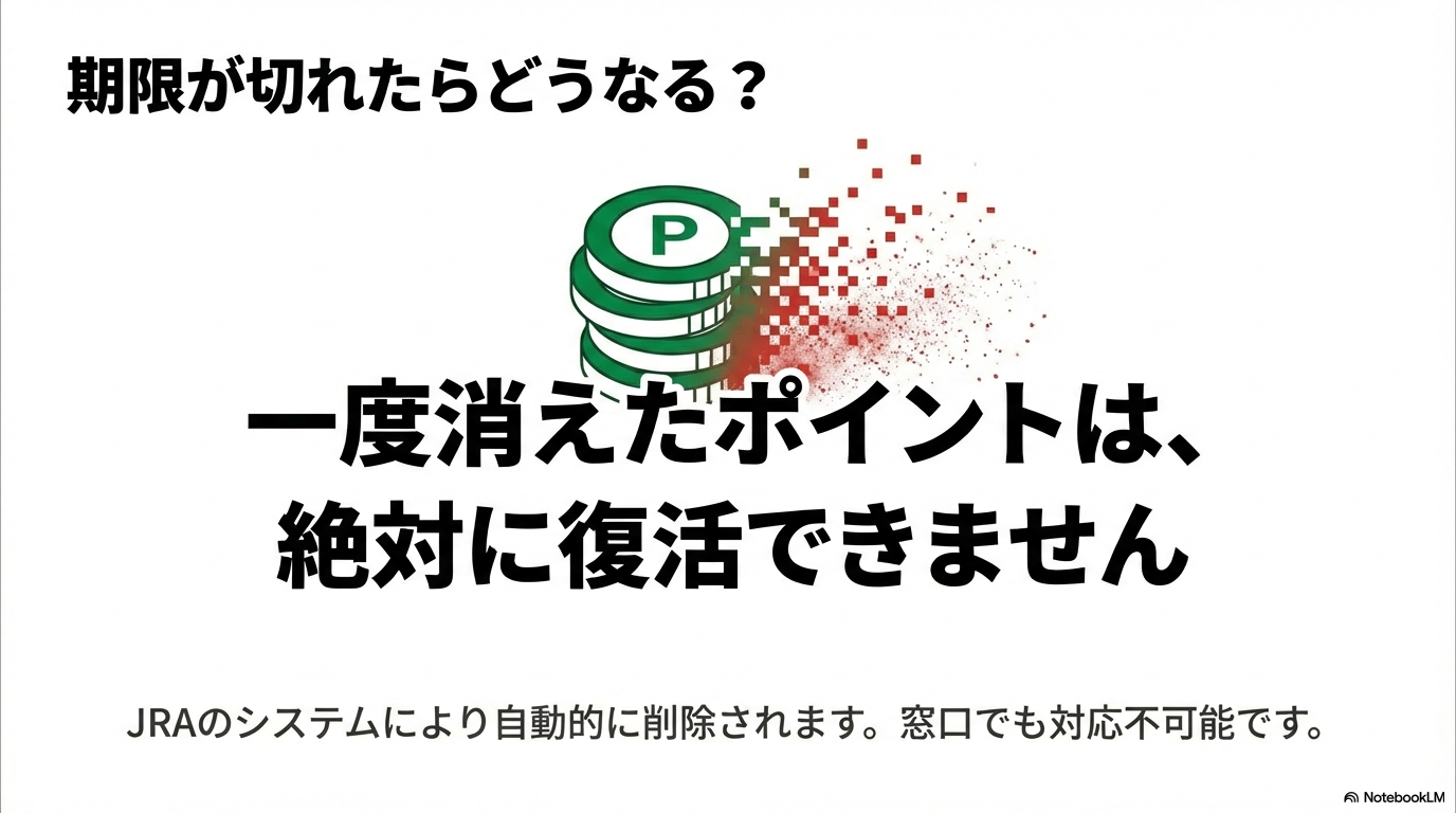 5年が経過して「自動解約」の処理が完了してしまうと、JRAの窓口へ行っても、どれだけ誠実に事情を説明しても、資産を復元することはシステム上不可能です。まさに、自己責任による厳格なルールと言えますね。