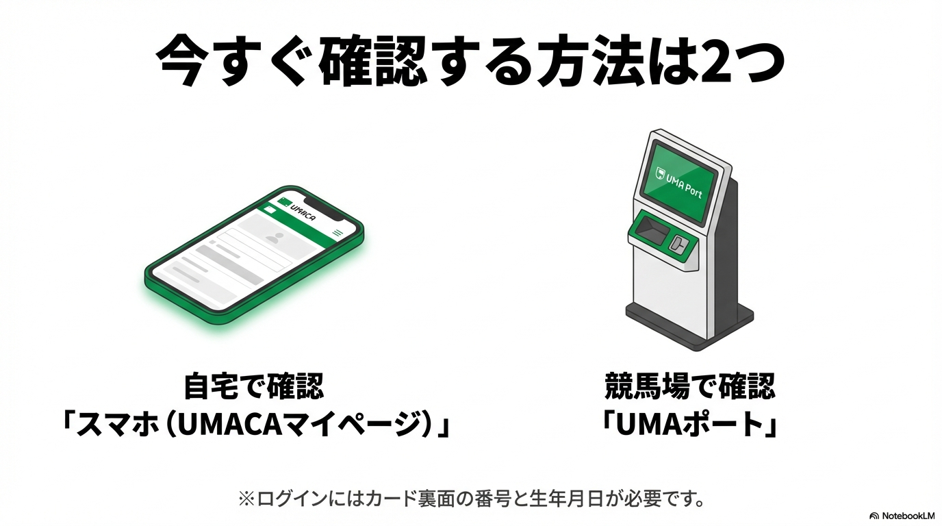 「わざわざ競馬場に行かないと確認できないのかな?」と思われがちですが、実はスマホでの確認が最も手軽で確実です。JRAが提供している「UMACAマイページ」にアクセスすれば、自宅にいながら現在の保有ポイントだけでなく、直近で消えてしまうポイント数まで把握できるんです。