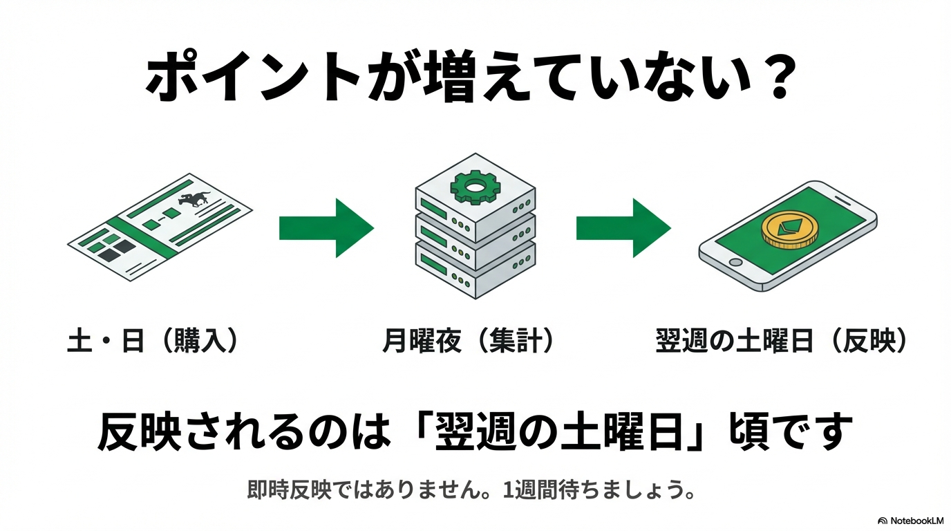 競馬場やウインズで熱い勝負を繰り広げた後、ふとスマホでUMACAマイページを開いて「あれ?今日あんなに買ったのにポイントが増えていない……」と不安になったことはありませんか?私も最初は「もしかしてカードの不具合かな?」と焦ったことがありますが、実はこれ、故障でもなんでもなくUMACA独自のシステム仕様によるものなんです。UMACAポイントは、PayPayや楽天ポイントのように決済した瞬間にリアルタイムで付与されるタイプではなく、一定の集計期間を経てから進呈される「後付け方式」を採用しています。具体的には、「節(通常は土日)」の開催終了後に1週間分の購入額をまとめて集計し、翌週の開催初日にプレゼントされるという流れになっています。つまり、土曜日にどれだけ的中させてポイントを稼いでも、それが画面に反映されるのは最短でも翌週の土曜日。この「1週間のタイムラグ」を知っておくだけで、無用な心配をせずに済みますね。