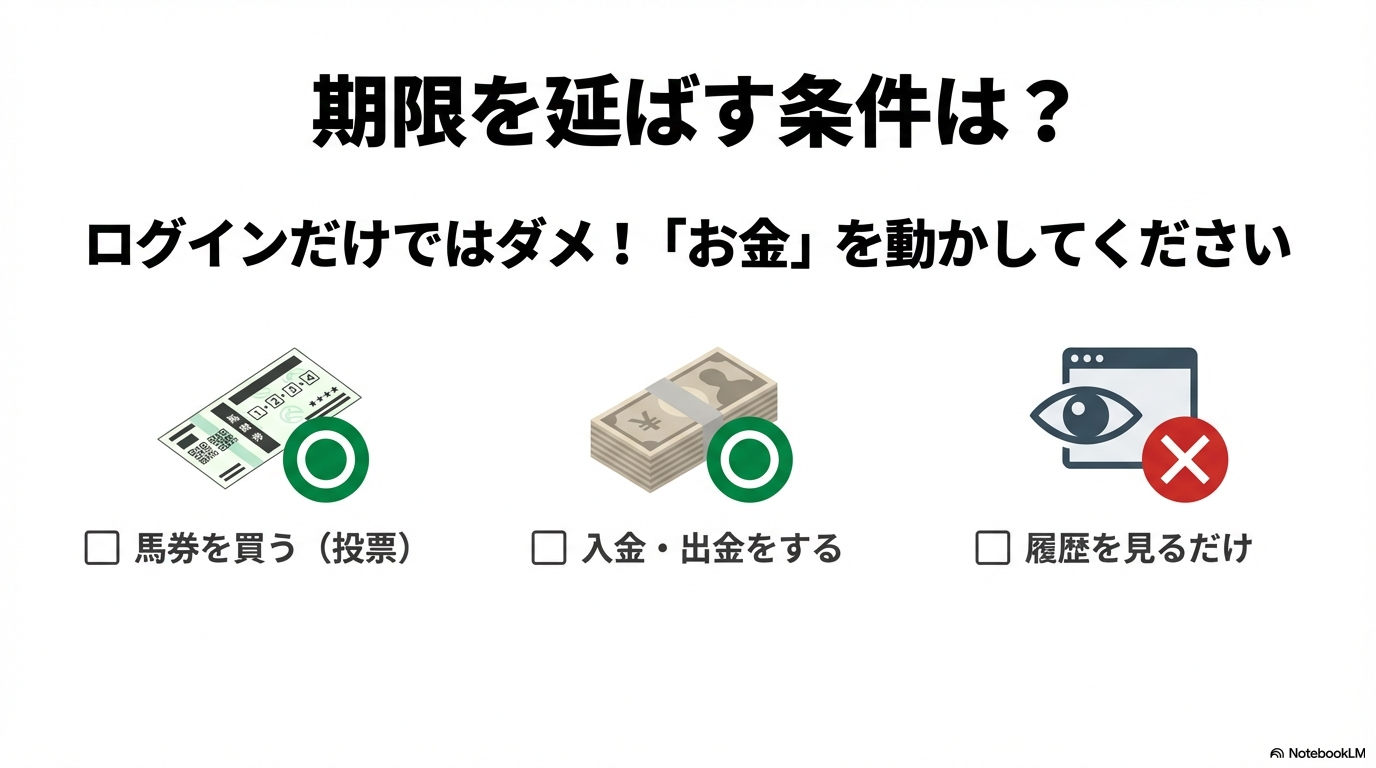システム側が「この会員は現在もアクティブである」と判断するのは、あくまで実際にお金が動いた時、もしくは馬券の購入が成立した時に限られます。