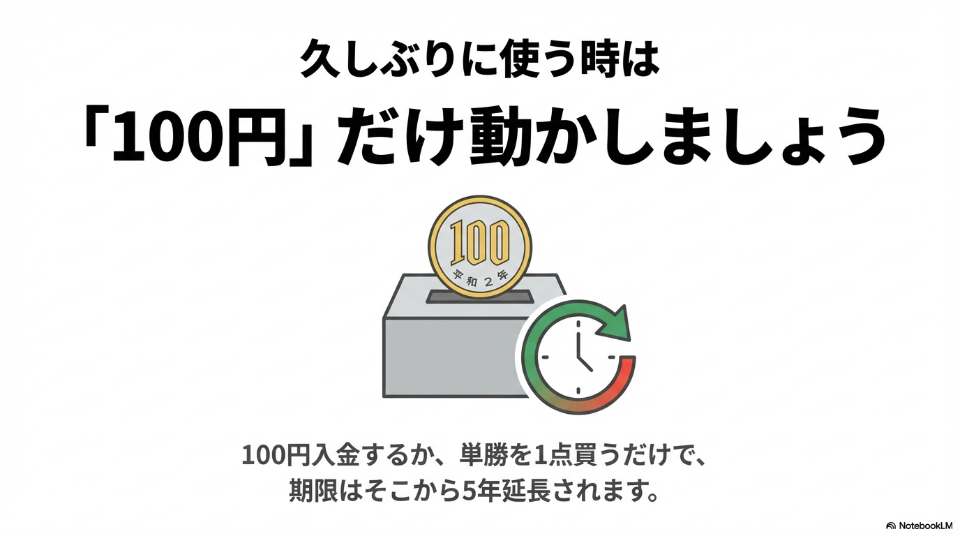 失効を防ぐための対策は非常に簡単で、5年に一度、たった一度だけ「100円」を動かせばいいんです。