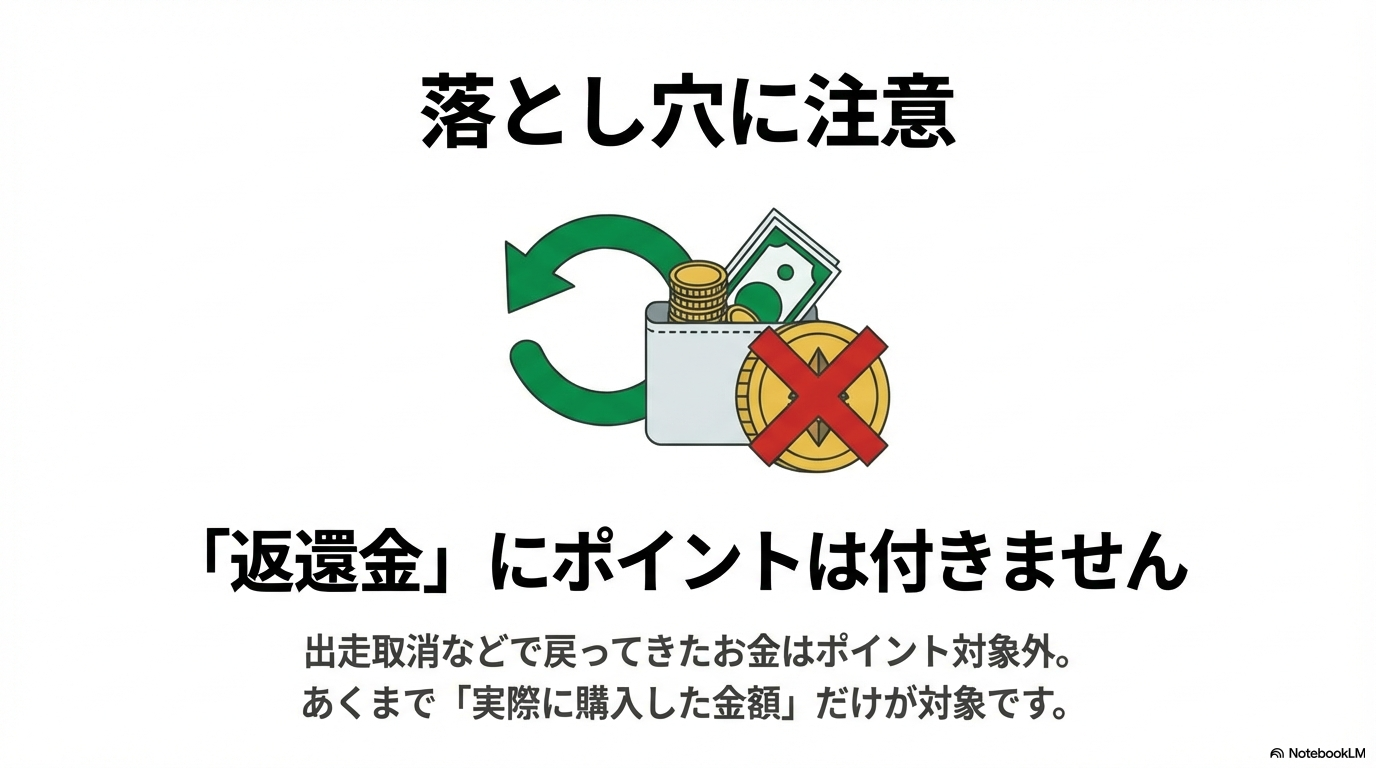 • 返還金:出走取消などで戻ったお金にはポイントは一切つきません。あくまで「実際に購入された馬券」が対象です。