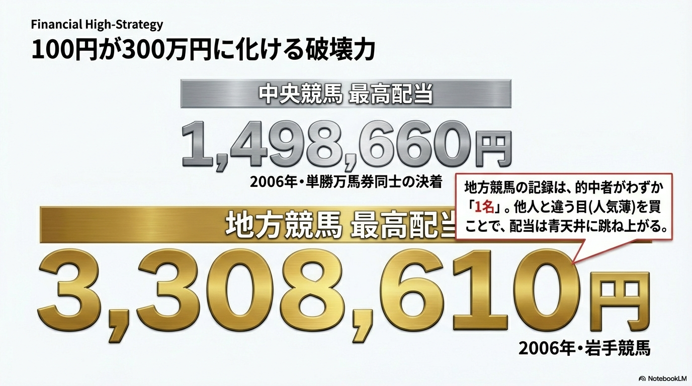 JRAの150万円も十分に衝撃的ですが、地方競馬にはさらにその上を行く、まさに「神の記録」が存在します。舞台は岩手県の盛岡競馬場でした。