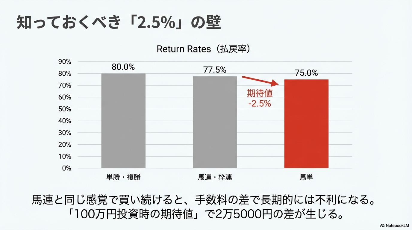 前のセクションでも触れましたが、現在のルールでは馬連の払戻率が77.5%なのに対し、馬単は75.0%です。つまり、表裏を均等に買うということは、実質的に「馬連を買っているのと同じ状態」でありながら、わざわざ「条件の悪い(控除率が高い)土俵」で勝負していることになるのです。