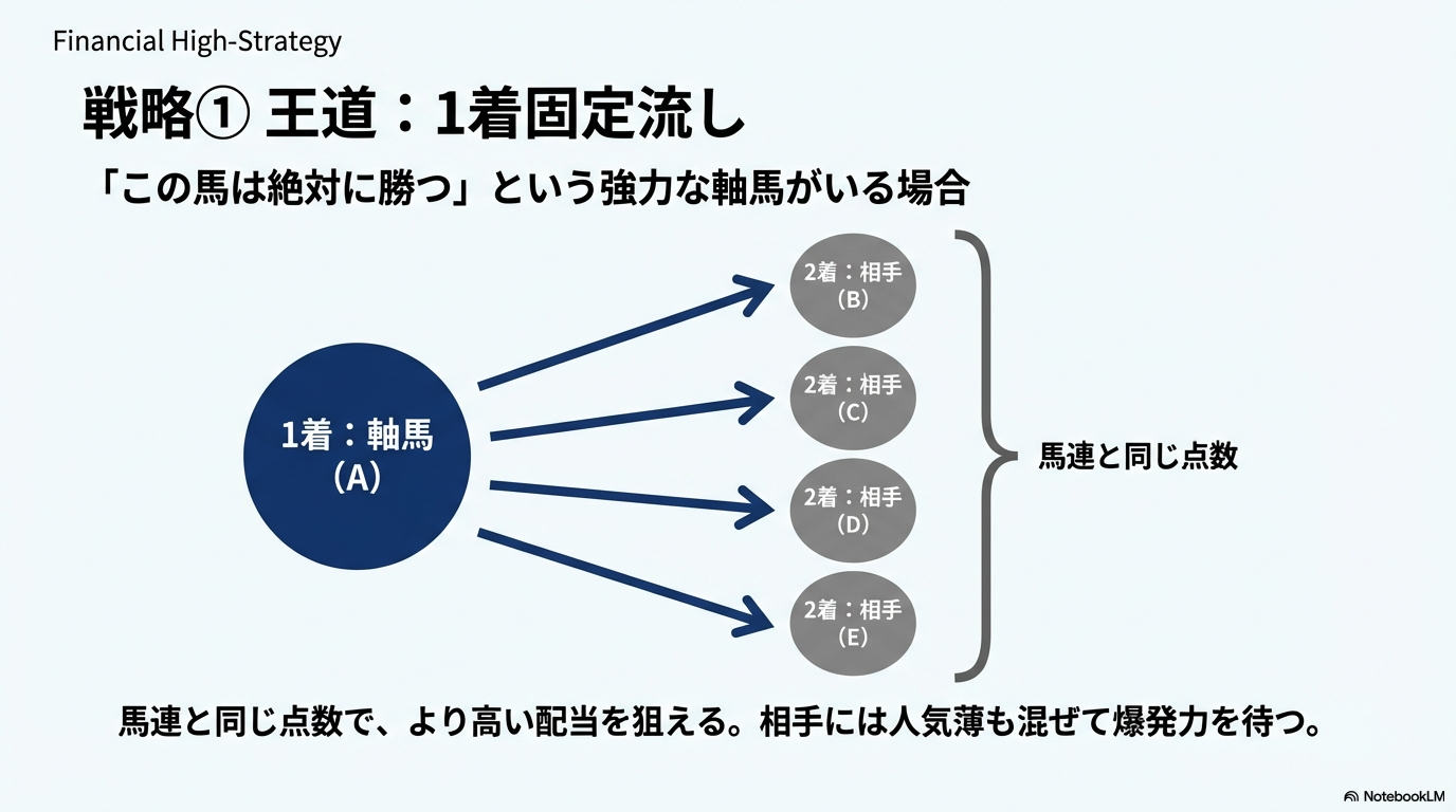 これが馬単の真骨頂であり、私が最も好きな買い方です。「単勝1倍台の圧倒的な1番人気馬」がいるレースこそ、この買い方が火を噴きます。