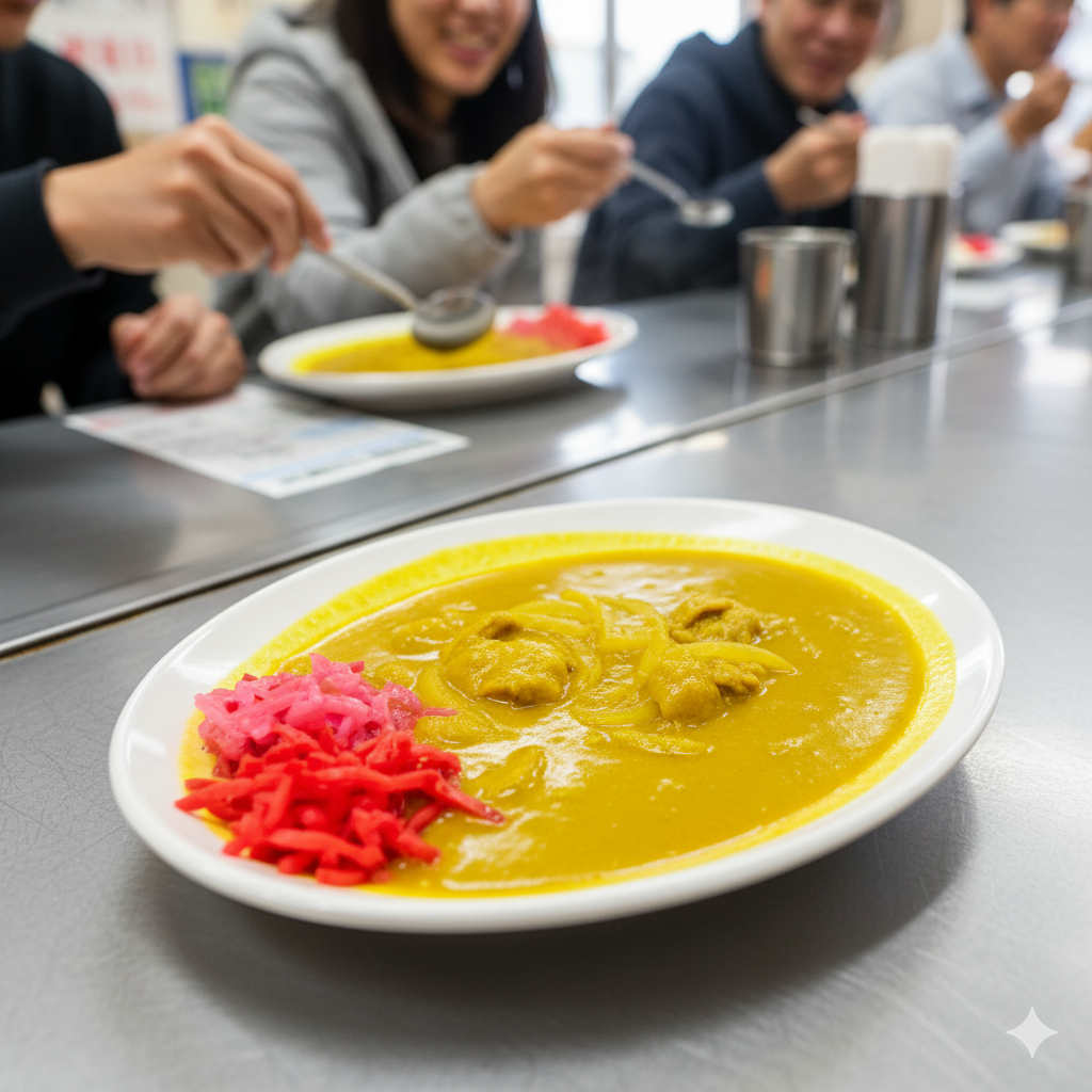 そして、この黄色いカレーに欠かせないのが、カウンターでセルフサービスで乗せる「福神漬け」と、真っ赤な「紅しょうが」です。黄色いルーに赤い薬味が映えて、まさに「ザ・食堂のカレー」というビジュアルが完成します。