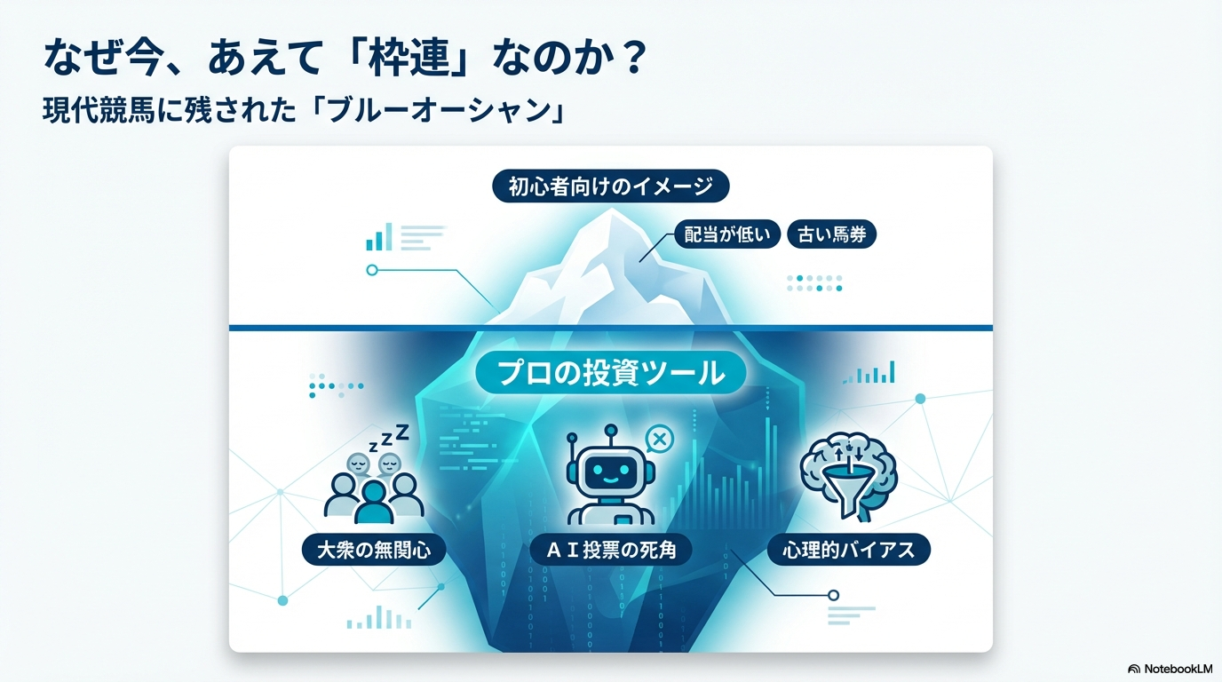 - AI投票の死角: 一部の自動投票システムが3連単や馬連に特化しており、枠連の歪みを補正しきれていない。