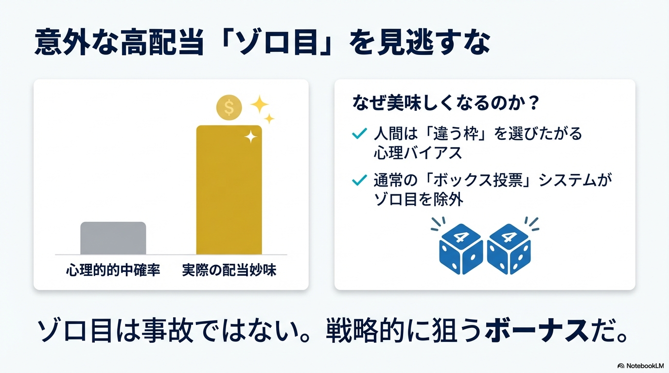- 心理的なバイアス: 「枠連は安い」という先入観が、美味しいオッズの放置を生み出します。