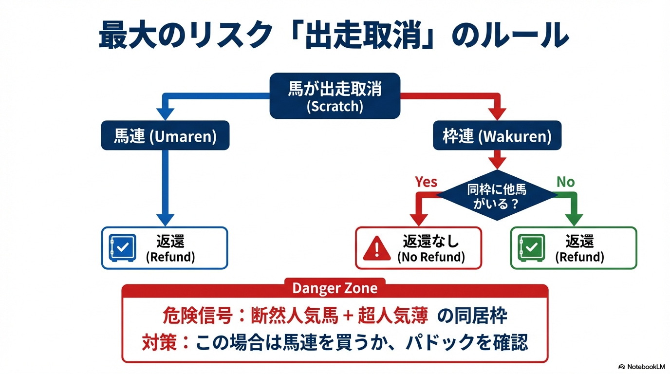 枠連投資において、初心者が最も陥りやすく、かつ精神的なダメージが大きいのが「出走取消・競走除外時の返還ルール」に関するトラブルです。ここだけは、他の馬券種(単勝や馬連など)とは根本的にルールが異なるため、絶対に理解してから購入する必要があります。